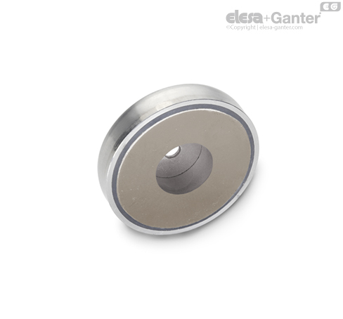 Upevňovací magnety GN 50.45 z nerezové oceli tvoří v kombinaci s pouzdrem z nerezové oceli a plastovým kroužkem / izolačním kroužkem systém, který chrání a zesiluje magnet pro optimální přenos magnetického toku na magnetický povrch.