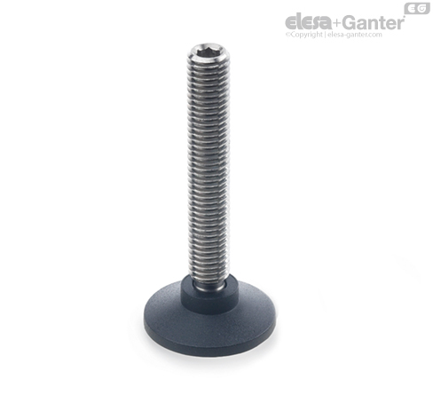 Polohovací nohy s kulovým kloubem se dodávají nesmontované. Přítlačný kuličkový čep závitového čepu lze v případě potřeby snadno zatlačit do přítlačné podložky a opět jej odejmout. Průměr kuličky d3 je menší než průměr jádra závitu, což umožňuje našroubovat závitový čep dovnitř na straně kuličky.