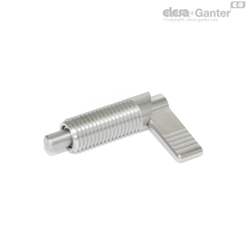 U pružinových pístků s páčkou GN 721.5 z nerezové oceli se zatažení čepu provádí otočením páčky k dorazu o 180°.