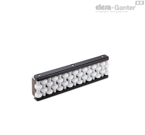 Tvar s válcovitou styčnou plochou, technopolymer z polyacetalové pryskyřice, barva bílá.