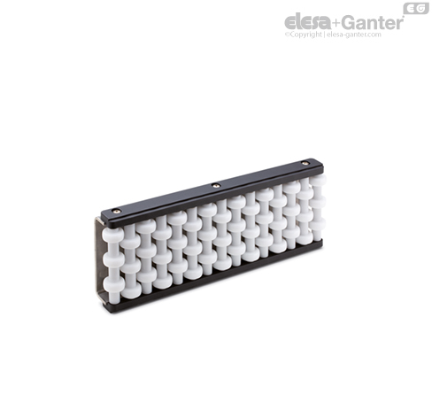 Tvar s válcovitou styčnou plochou, technopolymer z polyacetalové pryskyřice, barva bílá.
