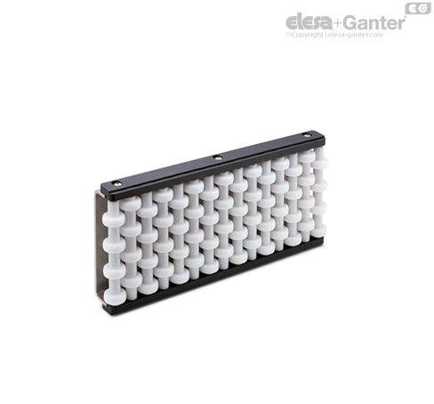 Tvar s válcovitou styčnou plochou, technopolymer z polyacetalové pryskyřice, barva bílá.