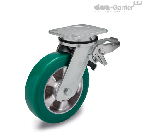 Vhodné pro použití v těžkém průmyslu a náročných podmínkách, např. boční nárazy nebo vysoká rychlost. Nalisované polyuretanové kolo zaručuje vynikající elasticitu a hodnotu valivého odporu a dobrou odolnost proti opotřebení a roztržení. Další informace viz. RE.F2.