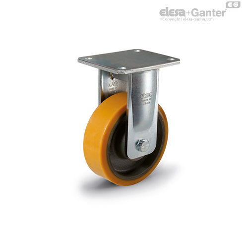 Vhodné pro použití v těžkém průmyslu a náročných podmínkách, např. boční nárazy nebo vysoká rychlost. Nalisované polyuretanové kolo zaručuje vynikající elasticitu a hodnotu valivého odporu a dobrou odolnost proti opotřebení a roztržení. Další informace viz. RE.F4.