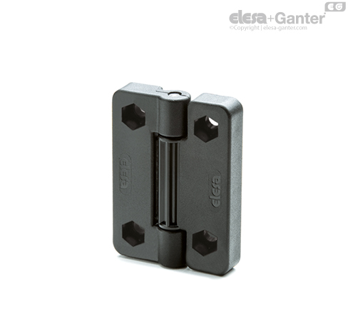 Aretační systém pantu (ELESA patent) umožňuje zajistit čtyři různé polohy otevření dveří (-90°, 0°, +70°, +115°).