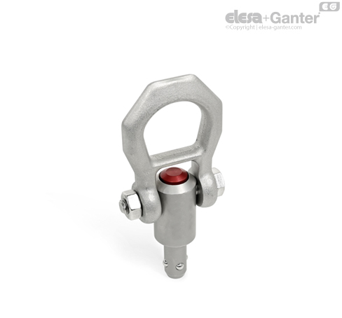 Závěsná oka s čepem GN 1130 jsou nosné prvky určené pro rychlé a snadné použití. Stisknutím červeného tlačítka se odjistí kuličky a čep je možné zasunout nebo vytáhnout z montážního otvoru. Oko se otáčí nejméně o 180° a má bezpečnostní mechanickou zarážku složící jako ochrana před neúmyslným odjištěním. V závislosti na směru tahu se může čep v montážním otvoru otáčet o 360° v zasunuté poloze.