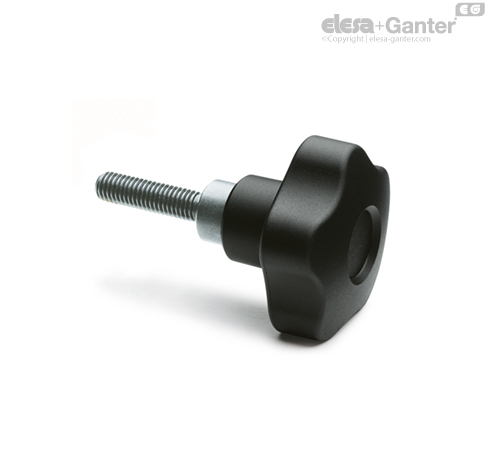 Technopolymer na bázi polyamidu (PA) vyztužený skelnými vlákny. Zabudované ozubené pouzdro ze zinkové slitiny pro spojení s upínacím prvkem, barva černá, matný povrch.