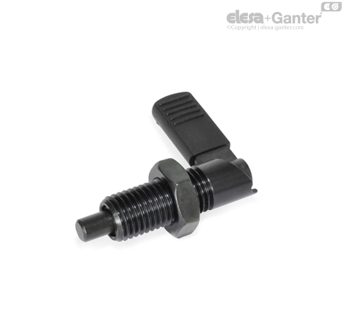 U pružinových pístků s páčkou GN 721.1 je zajišťovací čep udržován ve své zatažené poloze pomocí drážky.