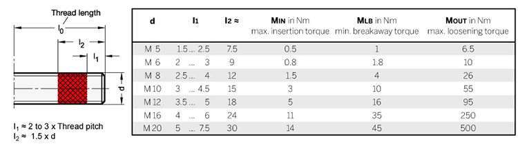 The torque value comply with DIN 267 Part 27. They are based on a test of a thread without preload with a nut thread of 6H at room temperature. For thread lengths l0 < l2, l2 is reduced in such a way that one to two thread turns are not coated at the end of the thread.