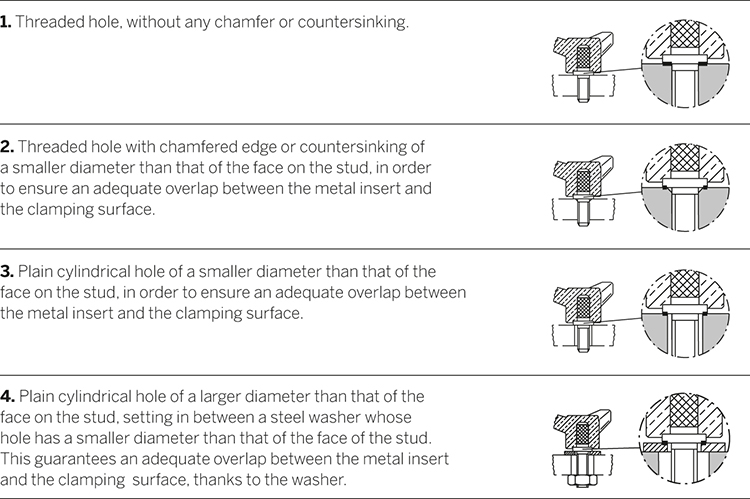 The plastic base on the clamping knob should never rest on the clamping surface. In this way the metal inserts (threaded stud or tapped boss) are never subjected to abnormal twisting ('corkscrew' effect) when axial tensile stress is applied. Thus, the anchoring of the metal insert to the plastic material is stressed in the correct way, that's to say it is only subject to the torque applied to the knob for tightening it.