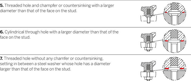 When the plastic base of the clamping knob rests directly on the clamping surface, the threaded stud or tapped boss are also subject to an axial load ('corkscrew' effect), which could jeopardize its anchoring to the plastic material. The values of this force are always higher, with a broad safety margin, than those that may be applied by normal operations performed by hand, but designers who wish to take into account cases of improper use should avoid the situations illustrated in cases 5-6-7.