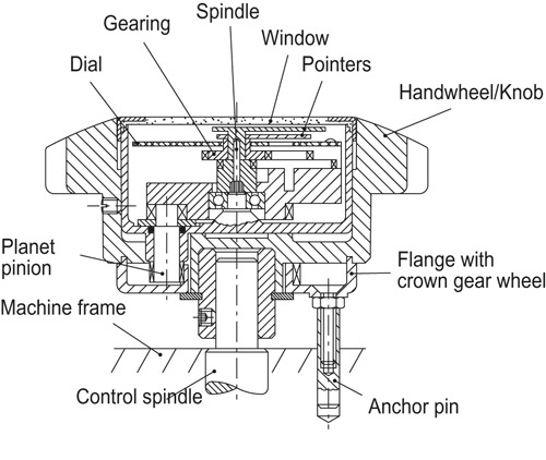 Suitable for use on control spindles in any position. The movement is housed in a sealed case (fig. 1). The handwheel/knob, containing the indicator, is coupled to the control spindle. On the rear of the handwheel/knob, a flange with internal crown gear wheel (shrouded) is fitted to the machine frame by means of an anchor pin (or similar). By so doing, during handwheel rotation, the flange is integral with the machine. The rotation of the handwheel causes the planet pinion to rotate, transmitting in this way the movement inside the indicator case. The rotation is then transmitted to both pointers by means of a gearing, while the graduated dial remains still, thanks to the fixing to the machine frame, by means of the anchor pin.