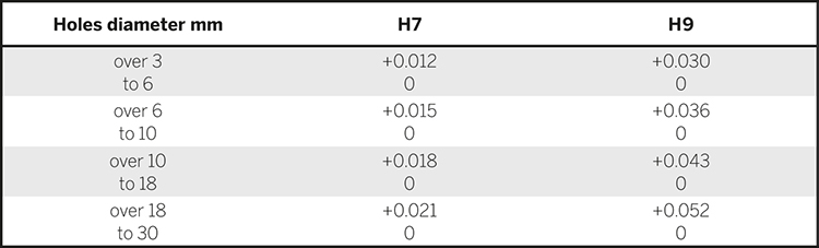 For the most widely used models, there are various kinds of standardized holes available so the user has a wide selection and is saved the costly task of remachining the hole on assembly. The tolerance of these holes is normally grade H7, but in a few cases it is grade H9. The degree of tolerance is always indicated in the tables of each article, in the hole size column. For cases in which it is more difficult to propose a standardization of the holes that satisfies the broadest range of assembly needs, either a pre-drilled hole with a simple roughing tolerance (hole with a smaller diameter than that of the shaft on which it is expected to be assembled), or a hub with no hole (not drilled) is used.