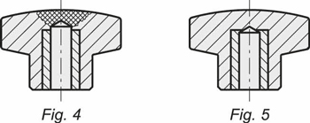 When remachining the hole of a built-in metal boss, always avoid operating as shown in Fig.4 , because both during the drilling operation and during the insertion of the small shaft, an area of the plastic covering may be subjected to stress, with the risk of cracking or detaching the part indicated with cross shading. The operation shown in Fig.5 is the most rational.