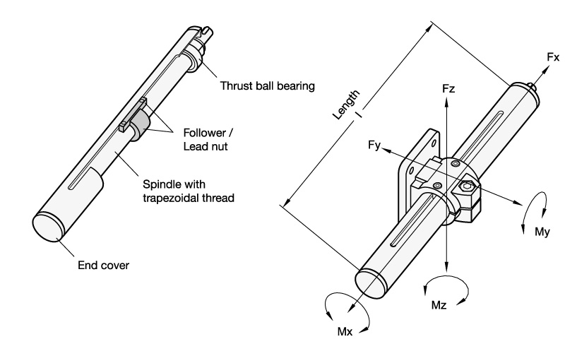 In applications where high torsion forces Mx occur, linear actuators with square tubing or double tube linear actuators should be given preference.