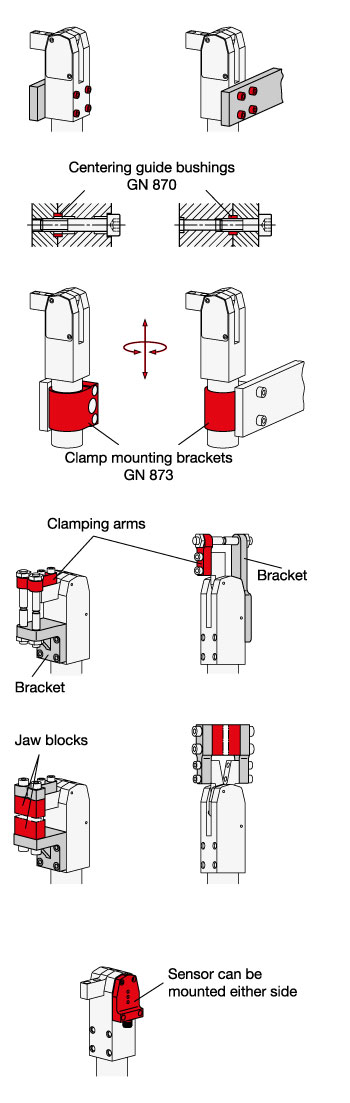 For the fixing and precise positioning of clamping arms and jaw blocks, GN 870 (see page 1645) centering guide bushings are also used. The individual data sheets give further information.