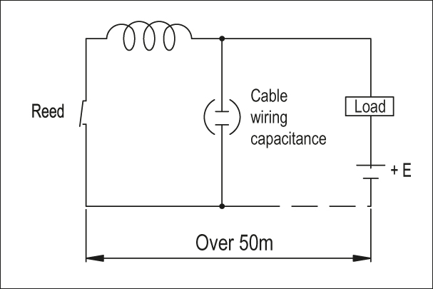 In case a Reed switch is connected to a load by a cable, over a long distance, the static capacitance caused by the cable will affect the Reed switch. Although it depends on the type of cable used, it is recommended that, in case the cable length exceeds 50 meters, protection is required for assuring a longer operating life of the Reed switch. In this situation an inductance in series to the Reed switch or a small resistance (currentlimiting resistor of 10 to 500 ohms) can be inserted.